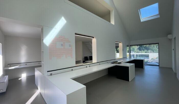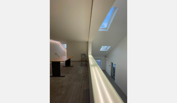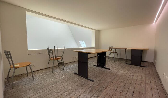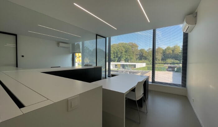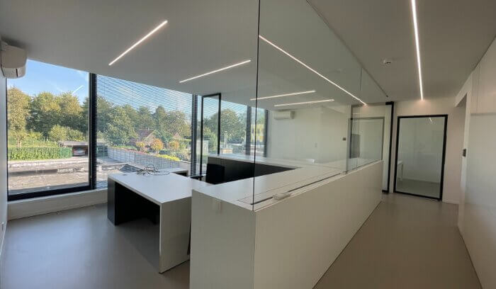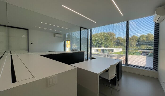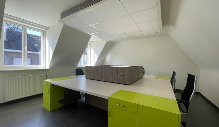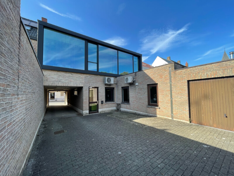 Indeling kantoor: Gelijkvloers: inkom/onthaal, grote bureelruimte voor 8 personen, eetruimte, kitchenette, toiletten, bergruimte (serverlokaal) en voormalige bankkluis, bureau en vergaderruimte. Verdieping: trappenhal, bureelruimte voor 4 personen, vergaderruimte, kitchenette, toilet, bergruimte, CV-ruimte, geïnstalleerde bureau en bureelruimte voor nog eens 8 personen met mezzanine. Technieken: cv op gas, water en elektriciteit aparte tellers, airco en alarmsysteem.